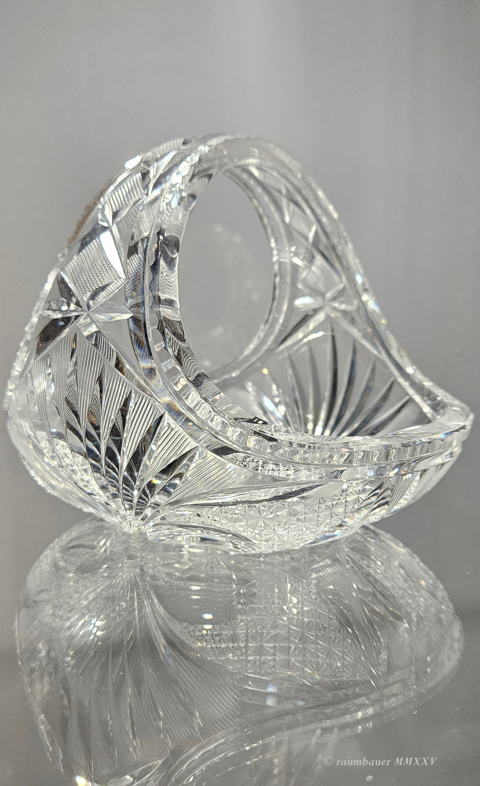 Eleganter Korb aus geschliffenem Bleikristallglas. Dieser spezielle Korb ist ein interessanter Blickfang zur Präsentation von Dekorationen auf Ihrem Tisch.