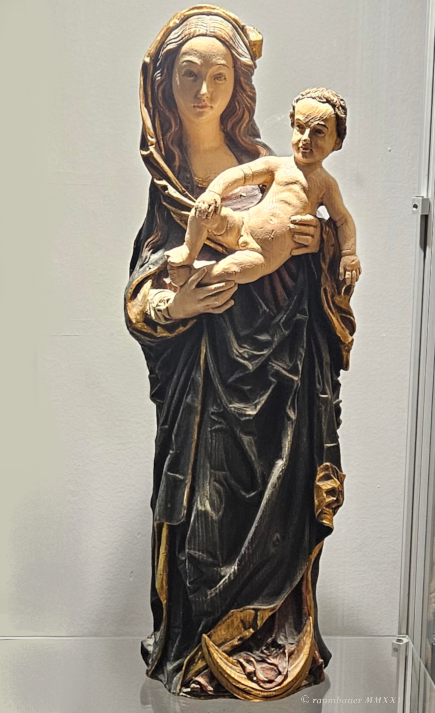 Handgeschnitzte Replik der Figur "Maria mit Kind". Das Original wurde um 1505 von Tilmann Riemenschneider hergestellt und wurde lange Zeit in Würzburg ausgestellt. Heute befindet sie sich im Kunsthistorischen Museum in Wien.